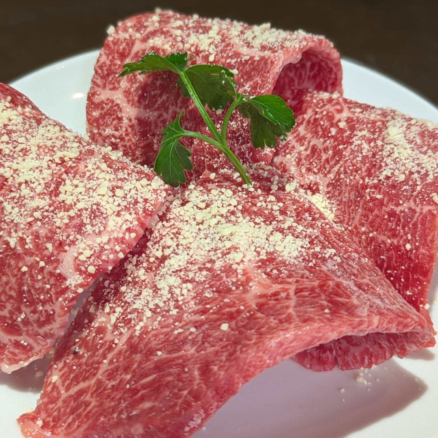 薄くスライスした仙台牛の赤身のお肉にパルメザンチーズをトッピングしてあります!サッと焼いてお召し上がり下さい!1590円(税込)